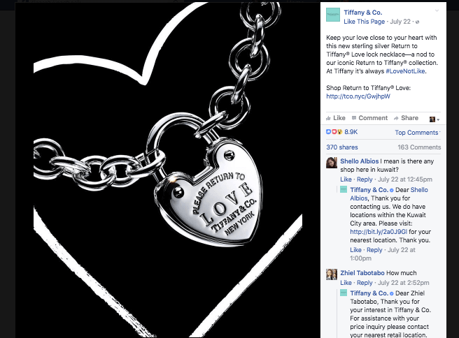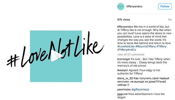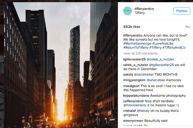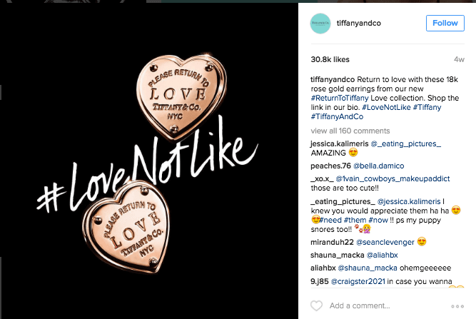 Marketers have long appreciated the power of storytelling — and through social media, it continues to be one of the most compelling tools for allowing customers to get to know your brand. Tiffany & Co. has created several successful social campaigns that harness this emotional tool, combining a memorable hashtag with captivating images and powerful text. #LoveNotLike is a recent campaign around which they’ve created a series of posts across different platforms that feature both photos of their jewelry as well as other imagery designed to evoke an emotional response from their audience.