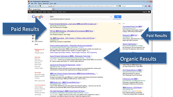Organic search results are below the shaded box of paid results. Organic search rankings are based on content quality, the relevancy of keywords strategically placed throughout the site, quality inlinks, and a slew of other elements. A website that wants high ranking results on organic searches must keep a few things in mind: