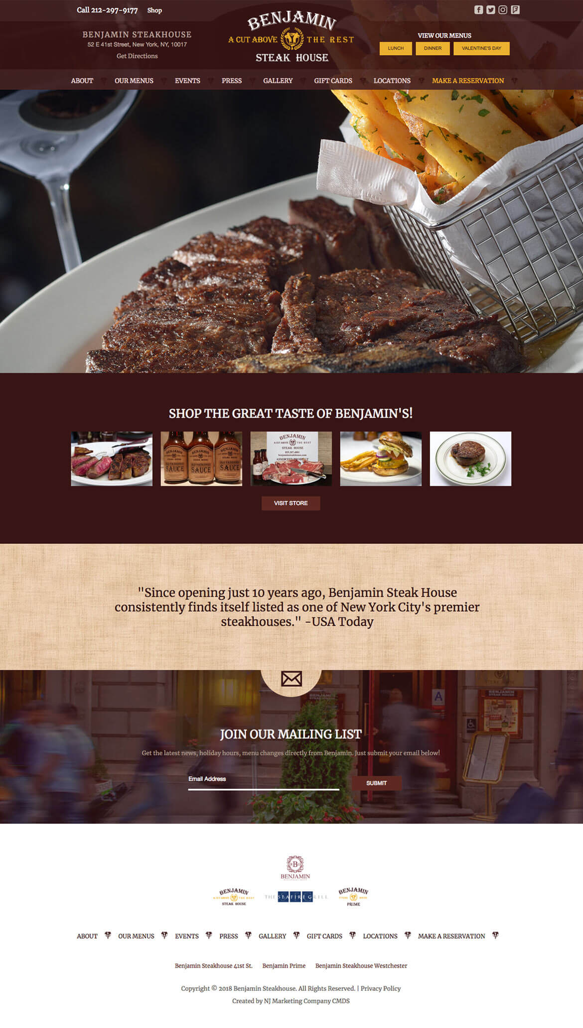 As a well-established and leading restaurant group in New York City and Westchester, Benjamin Restaurant Group was looking to re-invigorate elements of their marketing including the launch of a new restaurant, steak sauce, and e-commerce store. CMDS worked with Benjamin’s internal marketing team to develop brand identity materials, create a custom e-commerce website, as well as market and promote their four restaurants and direct-to-consumer e-retail business.