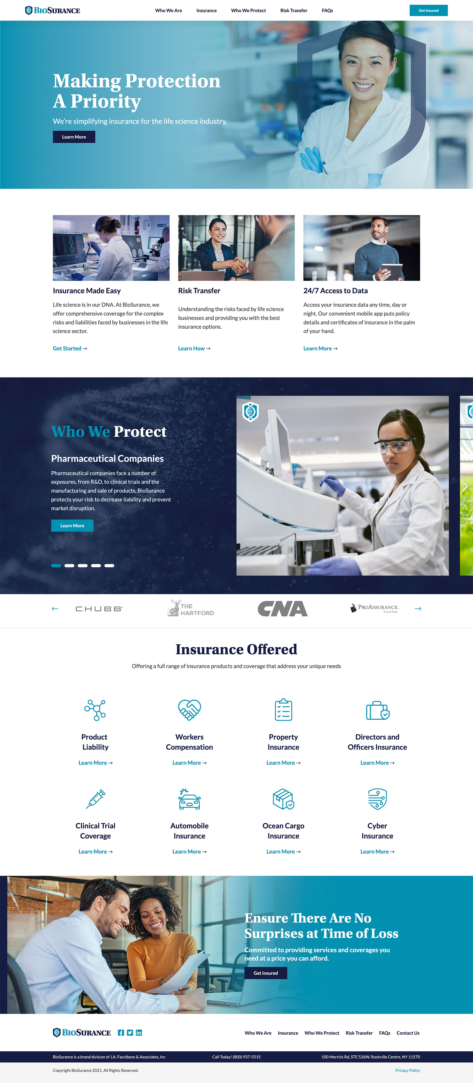 BioSurance came to CMDS when they were faced with a new evolution of their business. As a commercial insurance provider, J.A. Faccibene & Associates, Inc, they had operated for over 30 years, always having a significant niche in biotech, pharmaceuticals and life sciences. When it came time to create a new sub-brand, they turned to CMDS to assist with the entire branding initiative, from name creation to logo development, messaging guidelines to a brand-new website.