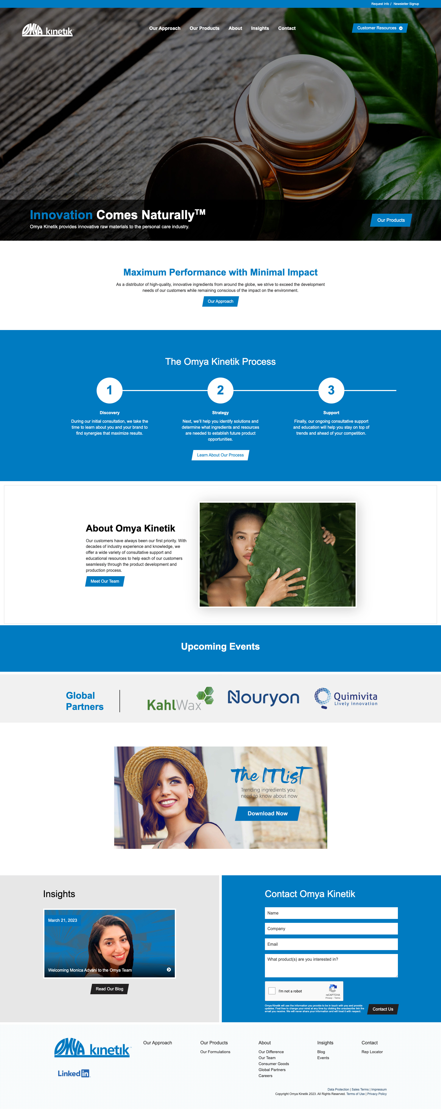 CMDS designed a new co branded logo that represents both Kinetik and Omya, while keeping the integrity of both brands. The existing Kinetik Technologies website was updated to reflect the Omya branding via updates to the color palette and messaging that speaks to both companies. Updates to the suppliers, team and location pages were also made to highlight the company's expansion. The new Omya Kinetik website has successfully merged the two brands while also maintaining the original customized product catalog data sorting and filtering functionality as well as the interactive map.