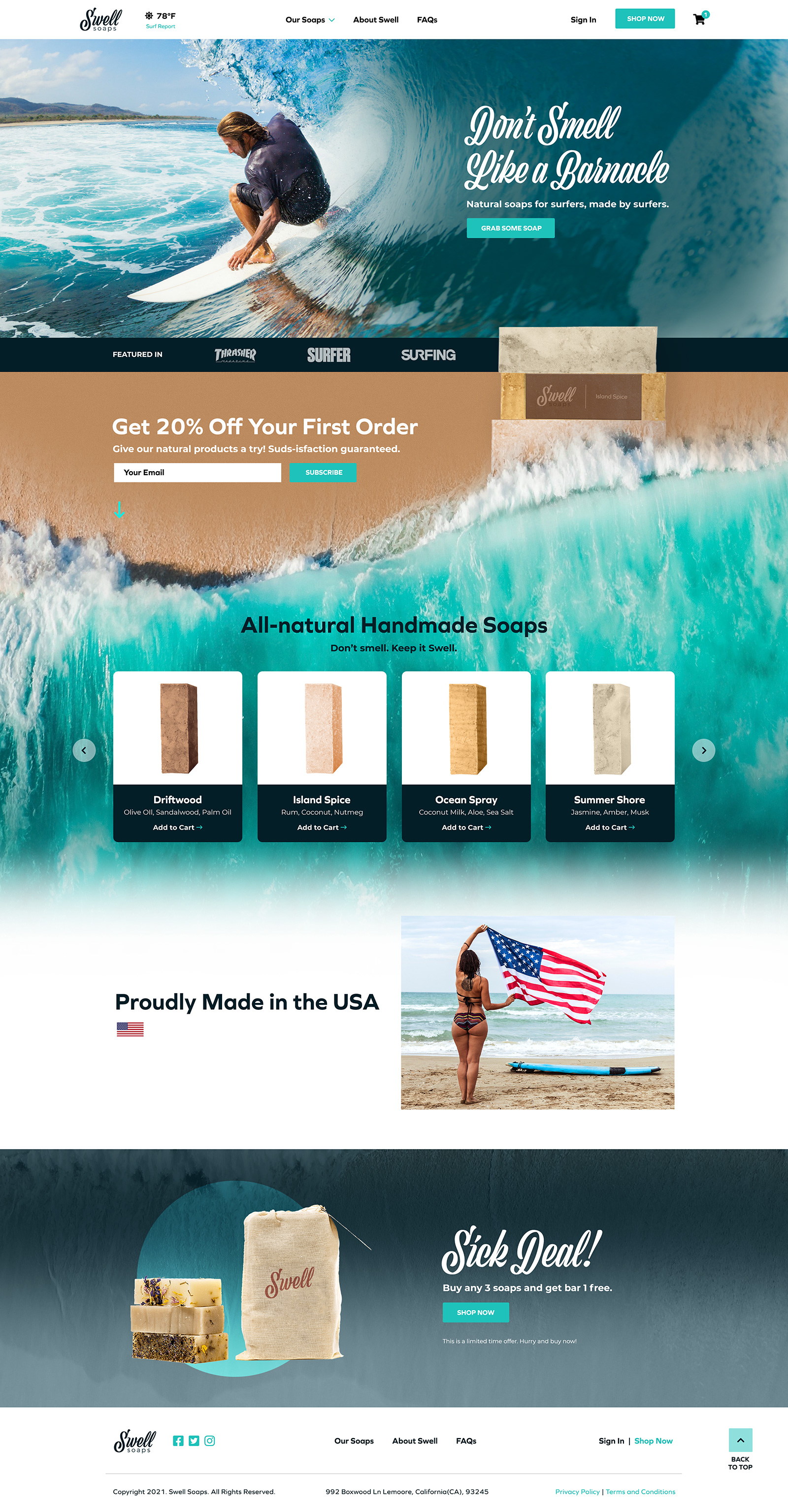 CMDS was contacted by lifestyle soap brand, Swell, when they were interested in bringing their brand (and company) to life. As a fully-funded start-up, Swell has a focus on handcrafted, organic soaps specialized for the surfer community. CMDS was ready to take on the task of brand and product naming, logo and brand development, product packaging and design, as well as the pinnacle, an amazing e-commerce website built within the Shopify platform.