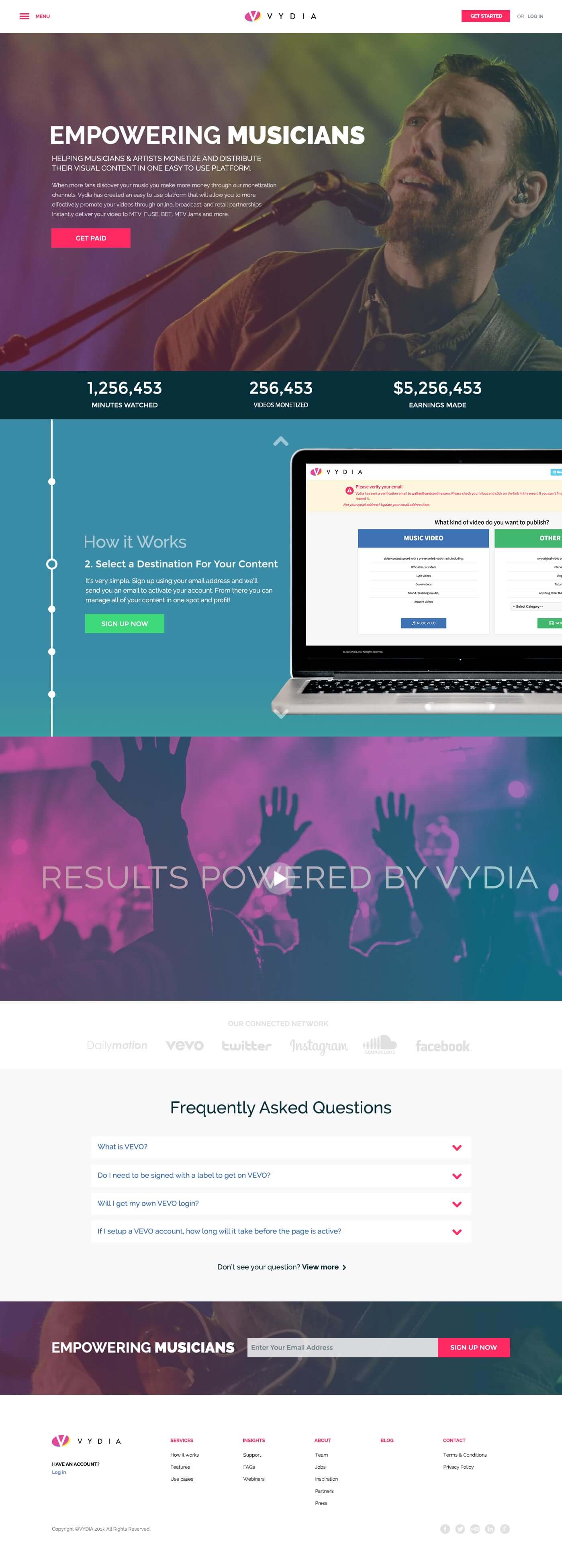 As one of New Jersey’s premier high tech startups, Vydia came to CMDS when looking to re-do their website in concert with a shift in their positioning. They were primarily known in the marketplace as a service that provided musicians the ability to monetize, promote, and distribute their music video content in a multitude of ways, however, they wanted to expand their appeal to essentially become the dashboard for creators of video content (regardless of industry) for managing all of their videos.
