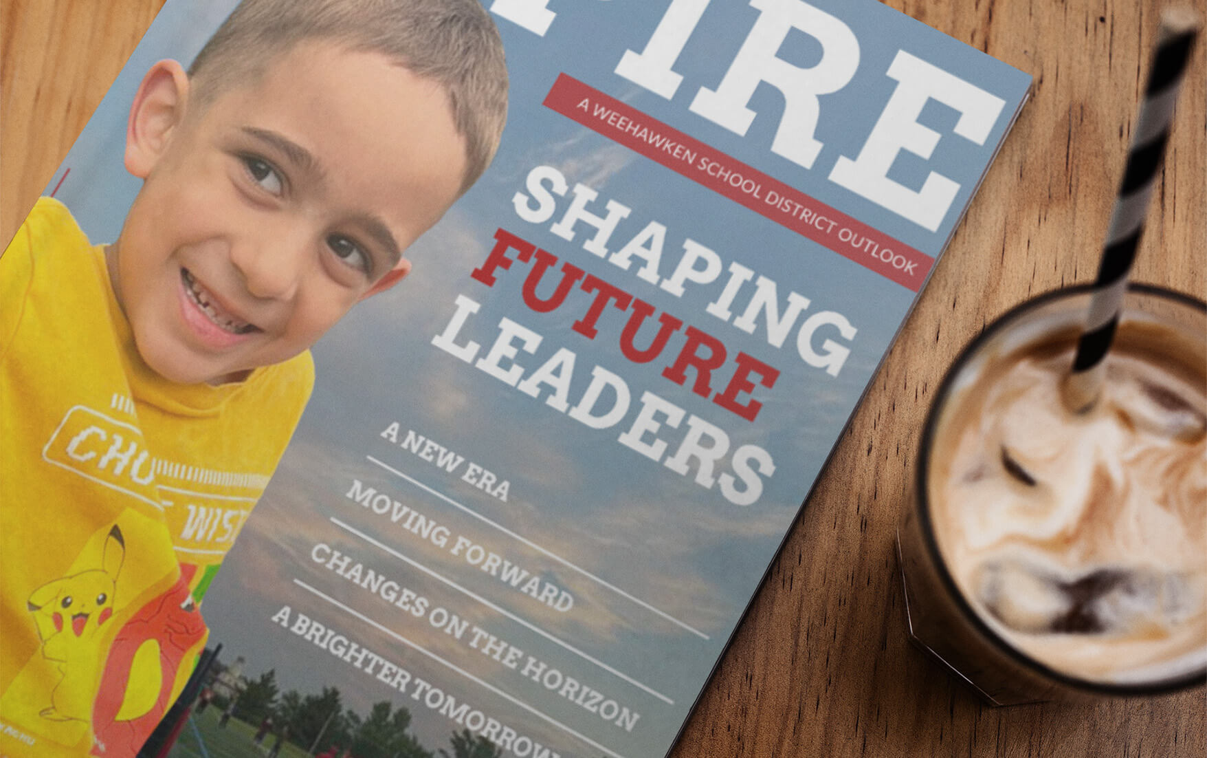Design an informative and progressive print magazine for Weehawken School District that communicates its goals, accomplishments, and vision through personalized photos and articles written by its principals and superintendent.